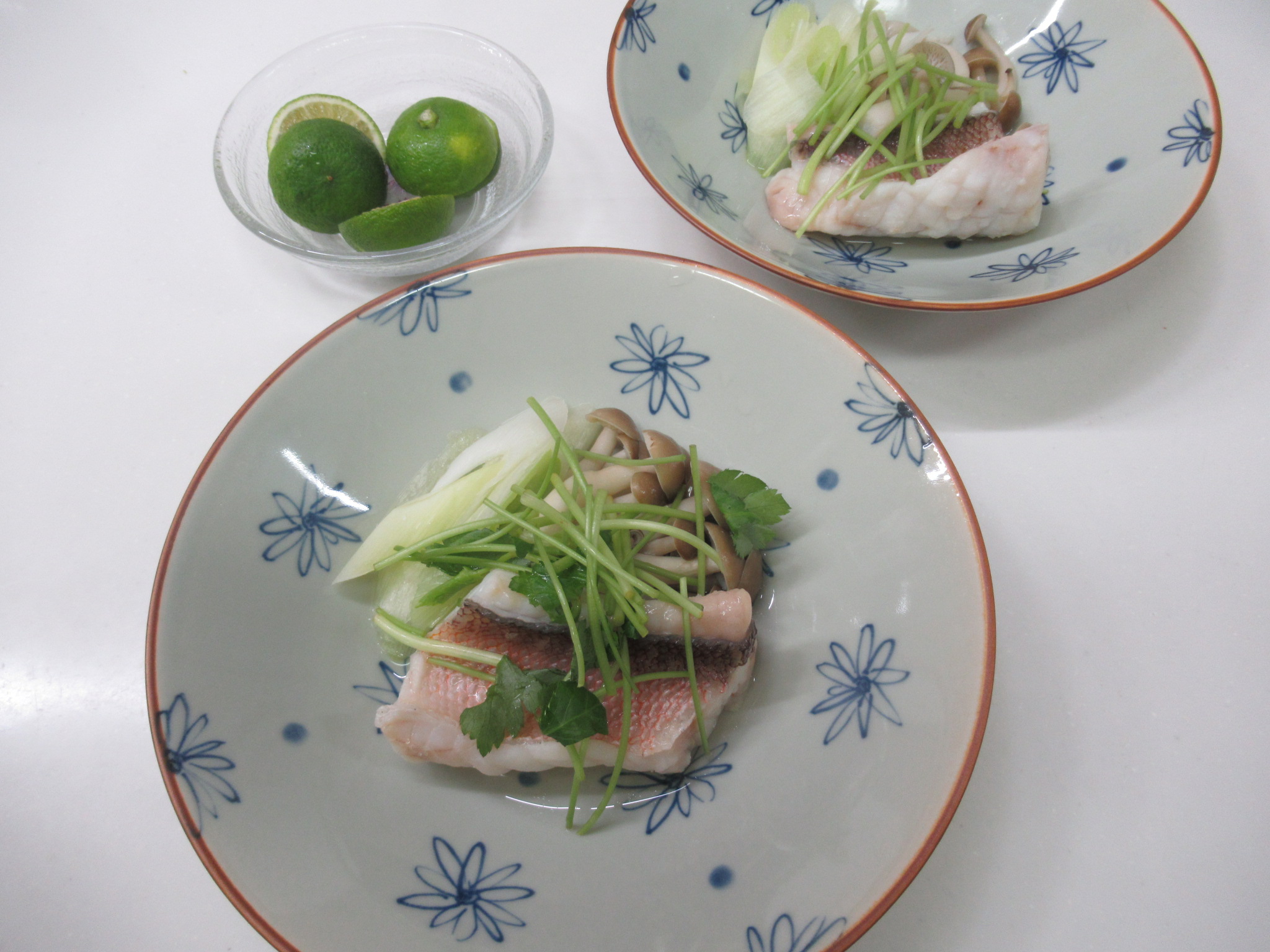 【材料】 甘鯛切り身:50g×4切れ、白ネギ1本、しめじ…