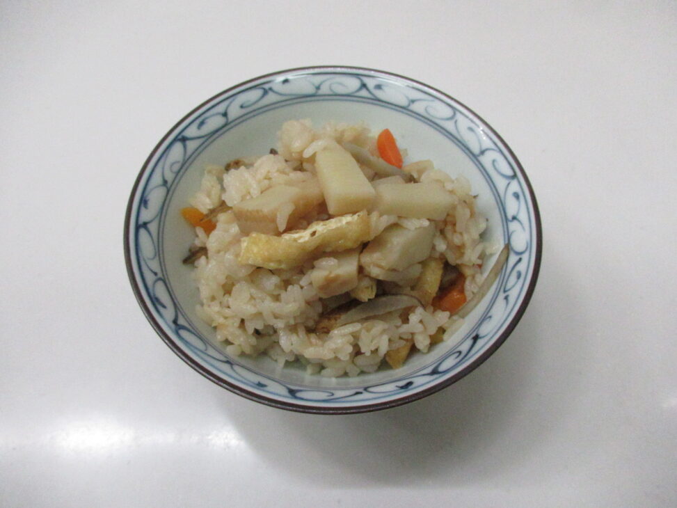 米:2.5合、たけのこ水煮:150g-200g、人参:中1本、ごぼう:40cm、昆布:10㎝角1枚、うすあげ:1枚、醤油:大1、塩:小1