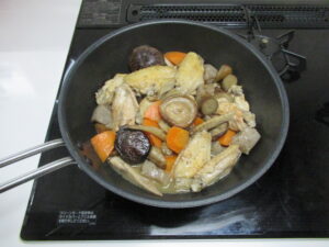 - 4~5分煮て材料に火が通ったら鶏肉をいったん取り出し。ふたを開けて1時間ほど冷ます(この間に味が浸み込む)。